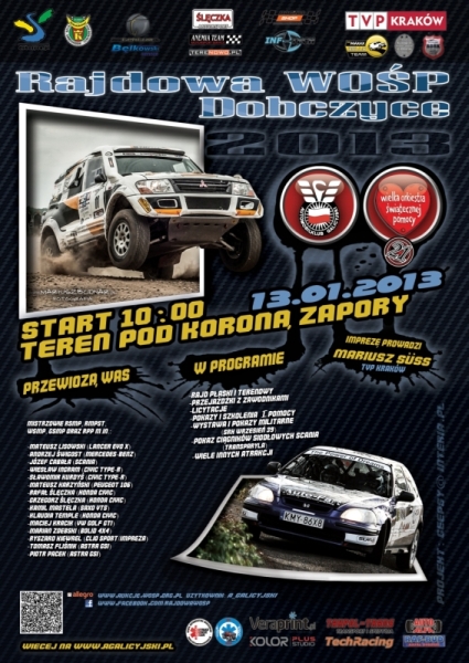 Już 13 stycznia 2013 roku odbędzie się kolejny finał Wielkiej Orkiestry Świątecznej Pomocy. Stało się już tradycją, że w tym szczególnym dniu w działania na rzecz fundacji włącza się również Automobilklub Galicyjski. Tak będzie i tym razem. Wspólnie z Gminą Dobczyce, Klubem Samochodów Terenowych „Żubry Kraków” oraz Husqvarna Bętkowski Service ma on zaszczyt zaprosić na Rajdową WOŚP w Dobczycach. Podobnie jak w latach ubiegłych impreza zorganizowana będzie na terenach pod koroną dobczyckiej zapory. W programie imprezy nie zabraknie zawodów sportowych w rajdach płaskich i terenowych, przejażdżek z zawodnikami, licytacji, , szkolenia z udzielania pierwszej pomocy, pokazu „SHR Wrzesień 39” oraz wiele, wiele innych. Wśród zaproszonych gości znajdują się zawodnicy z RSMP, RMPST, WSMP, GSMP oraz Rajdowego Pucharu Polski.