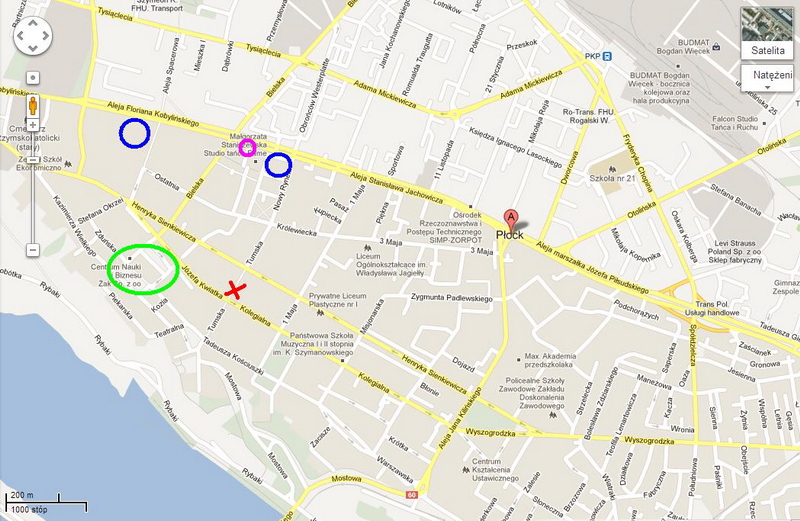 Granatowe kółeczka to place firmy która wynajmuje je komercyjnie. To przy Ul. Nowy Rynek to wielki parking przy głównej ulicy. Wybrukowany. Idealny na pokazy. Niestety na za blisko do żarcia ale nie tak daleko aby nic nie zjeść. Cena 2500+vat :-P