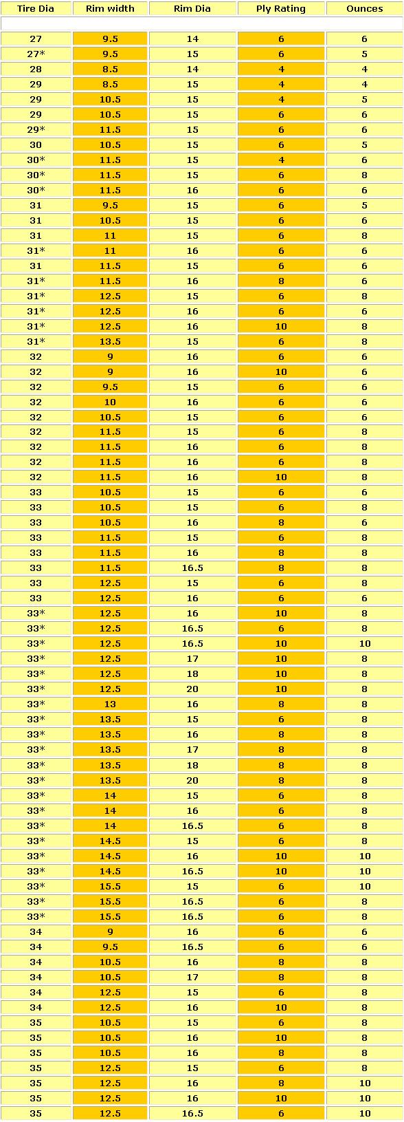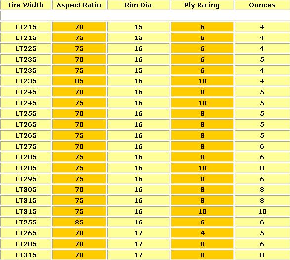 W załączeniu tabelki z rozmiarami opon i wagą kulek.
