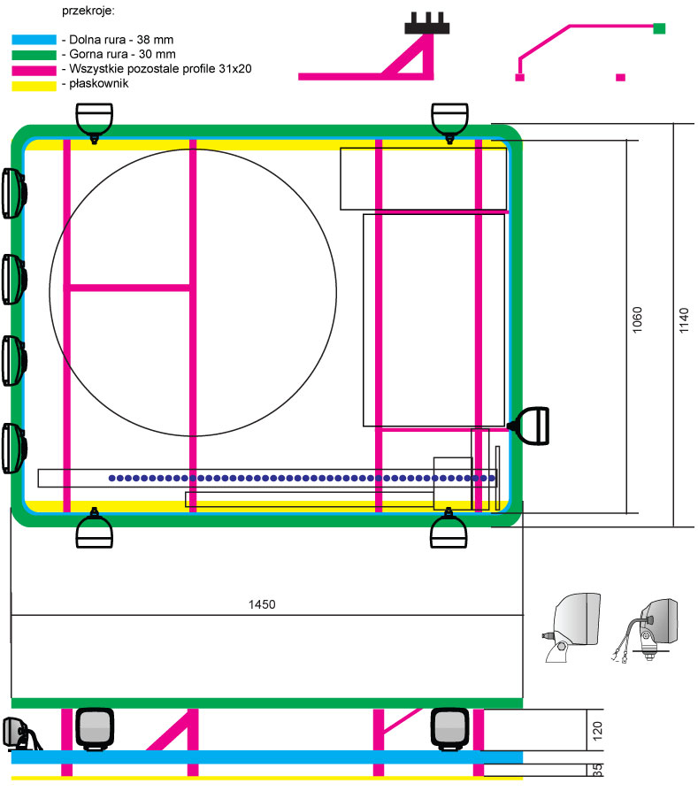 Mój projekt powstaje na bierząco w trakcie roboty, w sobotę sprawdze jak się zachowuje jak na nim stanę i postaram się wymyślec mocowanie do dachu,jak to wyjdzie to po niedzieli opis i foto tego etapu. W nestępnym etapie - wysuwana drabinka, jak się uda to mechanizm opuszczania i załadunku koła, hallo na przód, robocze na boki,może tablica z oświetleniem tylnym zdublowanym na górę, skrzynka, mocowanie łopat, hi-lift , itp.