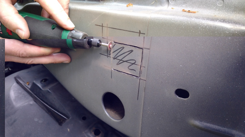 Dołączam kilka zdjęć z dalszych prac. Wycinanie otworu przez który dokonamy naprawy widocznego uszkodzenia blachy. Tamtędy leci woda do środka, spływa po tym okapie ale zawija się częściowo i płynie pod nim do dziury.