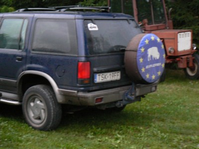 poniewaz moje mocowanie nadal sie mota (majster juz pomierzyl, cos wytoczyl ale jeszcze nie gotowe - nie popedzam bo zajety on jest ciagle) - wiec woze to wielkie kolo na dachu - nie tak fajnie jak kiedys u Yonego ale pomiedzy dwoma bagaznikami rowerowymi :D jako ograniczenie z boku: