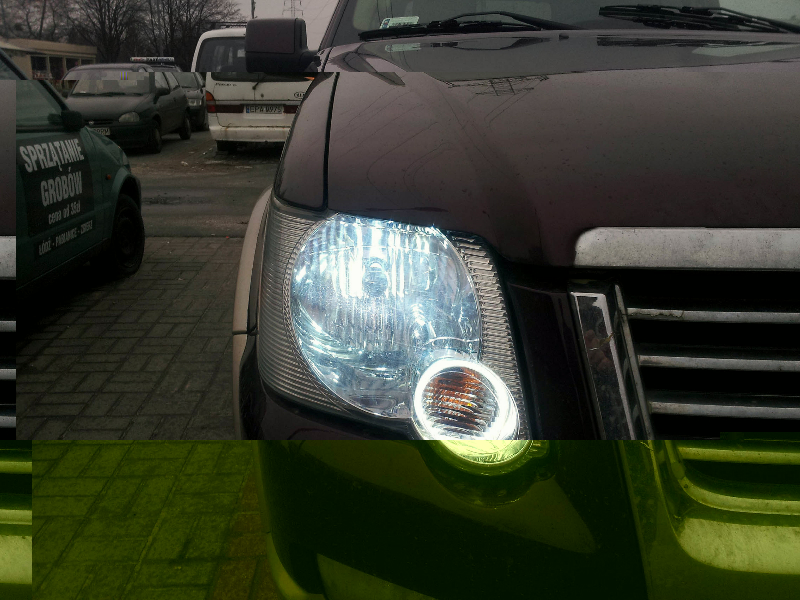 No i przy okazji: tak teraz wyglądają moje światła: jako pozycyjne jest biały ring (nie jest to światło do jazdy dziennej!), a mijania i drogowe jest bixenon z elektromagnesem. Lampę sprawdzałem i porównywałem z kilkoma innymi lampami seryjnymi - oprócz tego, że jest symetryczna, nic jej nie dolega, ma prawidłowe odcięcie, absolutnie nie oślepia (można patrzeć w lampę). Wreszcie wszystko widać i da się tym jeździć. Polecam.